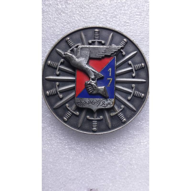 Médaille de table du 17e RA en métal inox de 68mm de diamètre, épaisseur totale 10mm, poids 125gr représentant l'insigne régimentaire du 17e RA