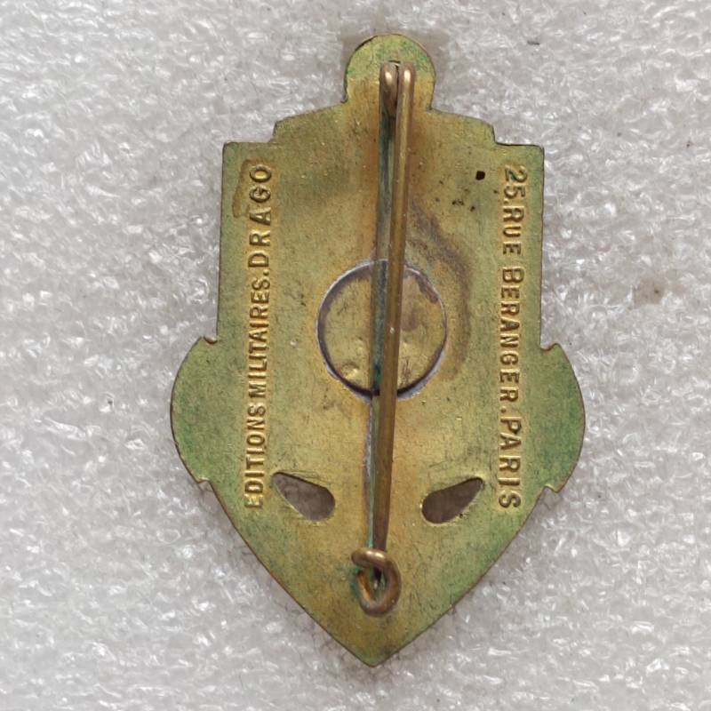 insigne émaillé fabriqué par Edit Militaires Drago 25 rue Beranger Paris, dos lisse plat, pastille lisse